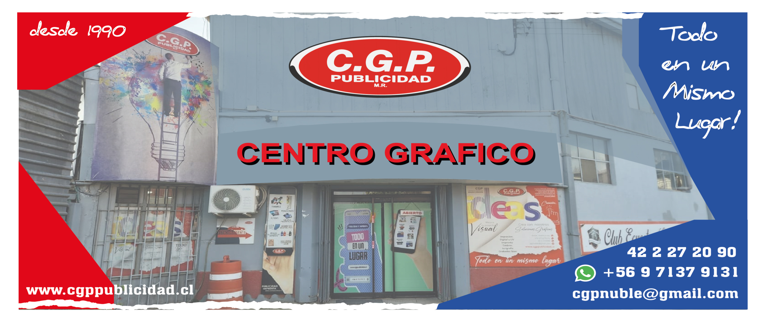CGP es una empresa chillaneja, desde 1990 al servicio de la comunicación visual. Tiene por objetivo ofrecer soluciones gráficas efectivas a sus inquietudes personales y/o empresariales. Somos su apoyo en imagen y creación, ya que cada día tratamos de mantenernos a la vanguardia en la tecnología gráfica, entregando a nuestros clientes el mejor resultado, para que su empresa se destaque en este mundo vertiginoso de cambios. De este modo queremos ofrecerle nuestros servicios, con trabajo de diseño gráfico, atendido por profesionales capaces de captar y entender el requerimiento que usted necesita para mejorar su proyecto visual.